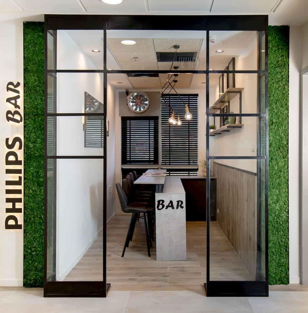 בפרויקט משרדי פיליפס שילבנו מספר חומרי גלם יחדיו, ויצרנו מספר אלמנטים בהתאמה אישית, ובתכנון עיצובי מוקפד. השילוט נוצר כתוצאה משילוב בין פרספקס ופלדה, מחיצות מעוצבות כעיגולים, בהתאמה עם המעצב, מייצרות שילוב ייחודי: זכוכית רטרו, צמחיית מוס, לוח שעם ,מחיק מגנטי ועוד. החלון המואר בעל הפרופיל הבלגי מוסיף אלמנט עיצובי נקי ומדויק לסביבה הייחודית הזו.